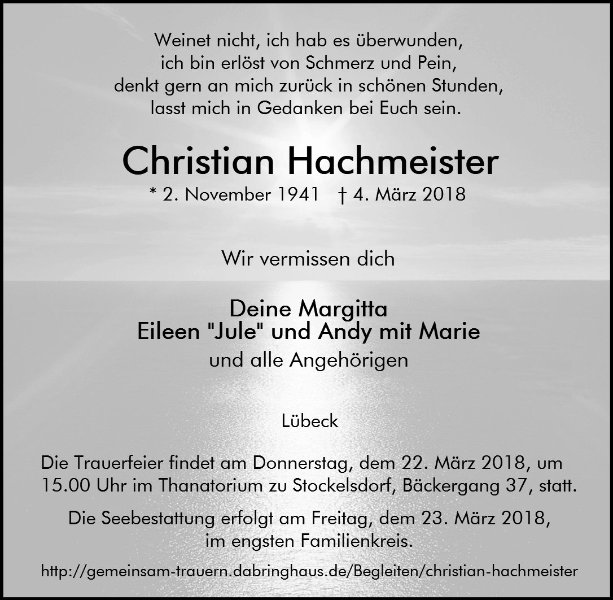 Weinet nicht, ich hab es überwunden,ich bin erlöst von Schmerz und Pein,denkt gern an mich zurück in schönen Stunden, lasst mich in Gedanken bei Euch sein.