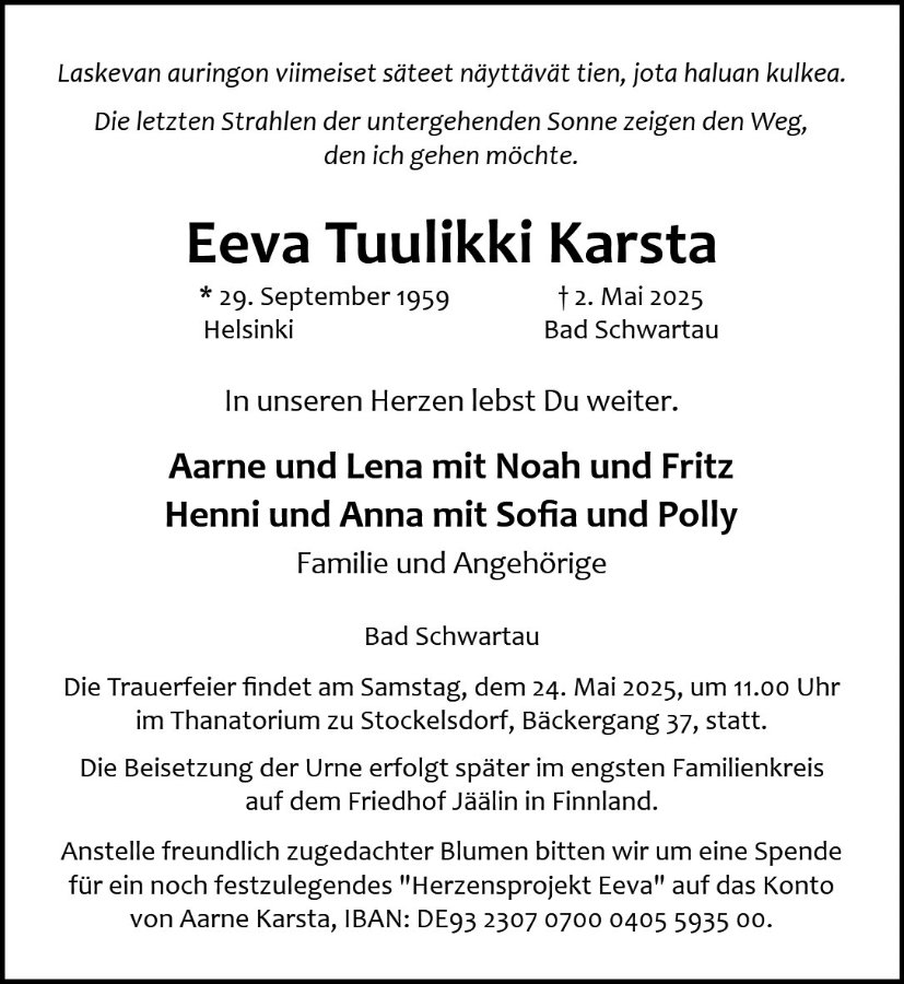 Mit großer Trauer und tiefem Mitgefühl haben wir die Nachricht von deinem Tod erhalten. Du, unsere Diplomatin, hast durch deine herzliche Art und Weltoffenheit Türen geöffnet und Menschen vereint. Überall, wo du aufgetreten bist, sind dir die Herzen zugeflogen. Mit deiner positiven Energie warst du eine unerschöpfliche Quelle der Kraft und Inspiration für uns alle. Bei Fragen zu politischen Kontakten war unser Credo stets: "Lass uns mal bei Eeva nachfragen."