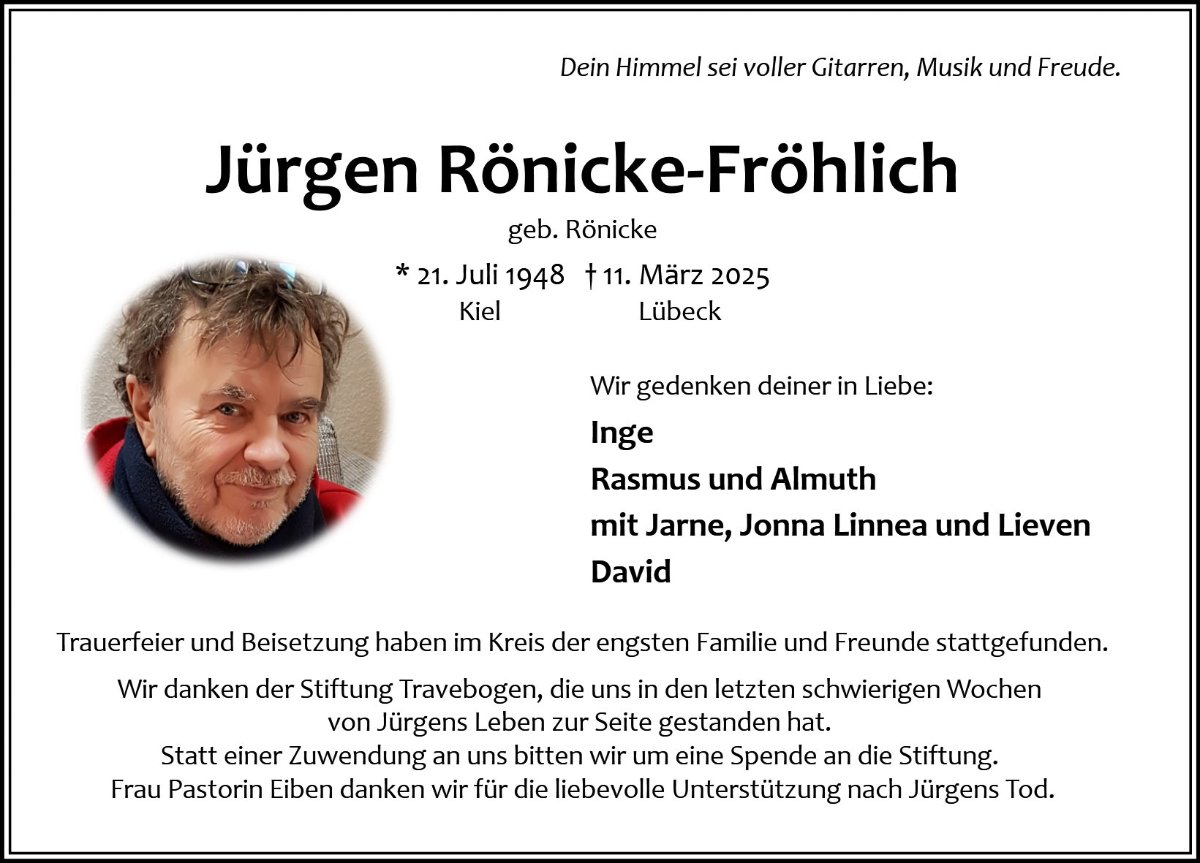 Anstelle freundlich zugedachter Blumen oder Kränze bitten wir um eine Spende zugunsten der Stiftung Travebogen: https://www.stiftung-travebogen.de/spenden