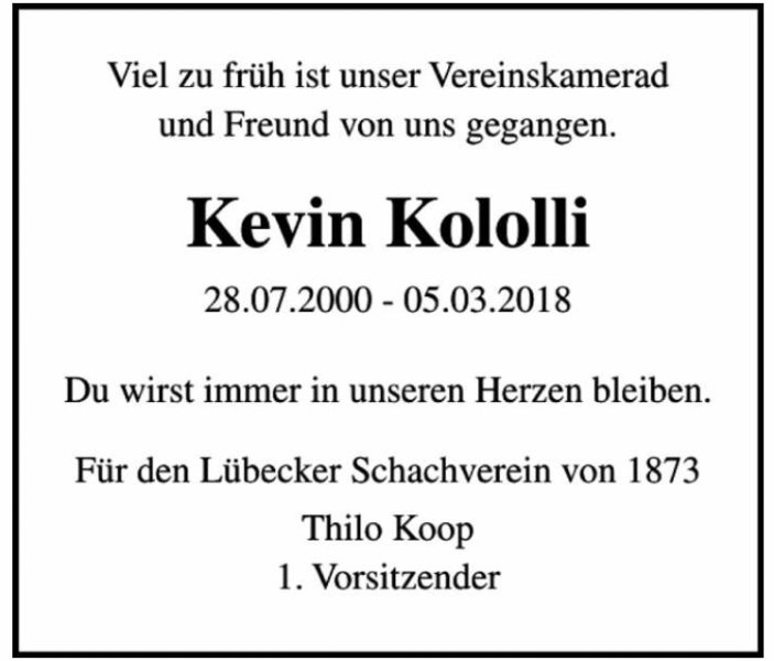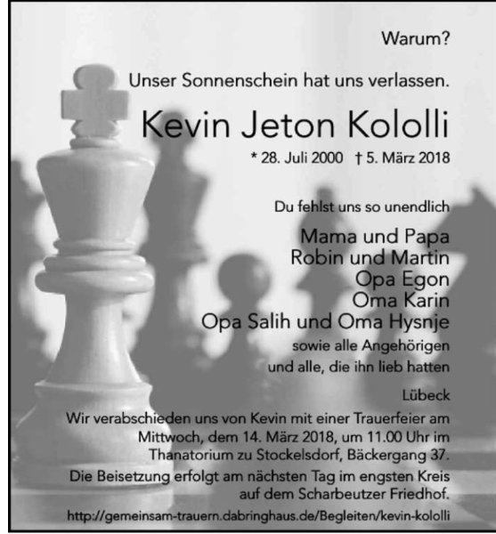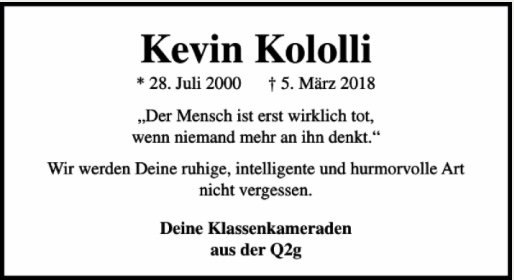 Kevin Jeton Kololligestorben am 5. März 2018