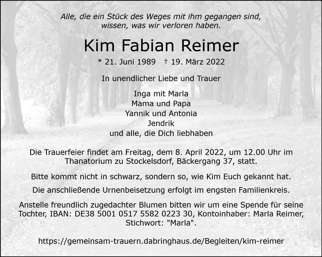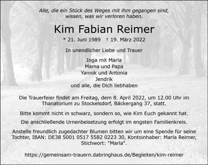 Wir haben von Eurem schmerzhaften Verlust Eures Sohnes Kim erfahren.