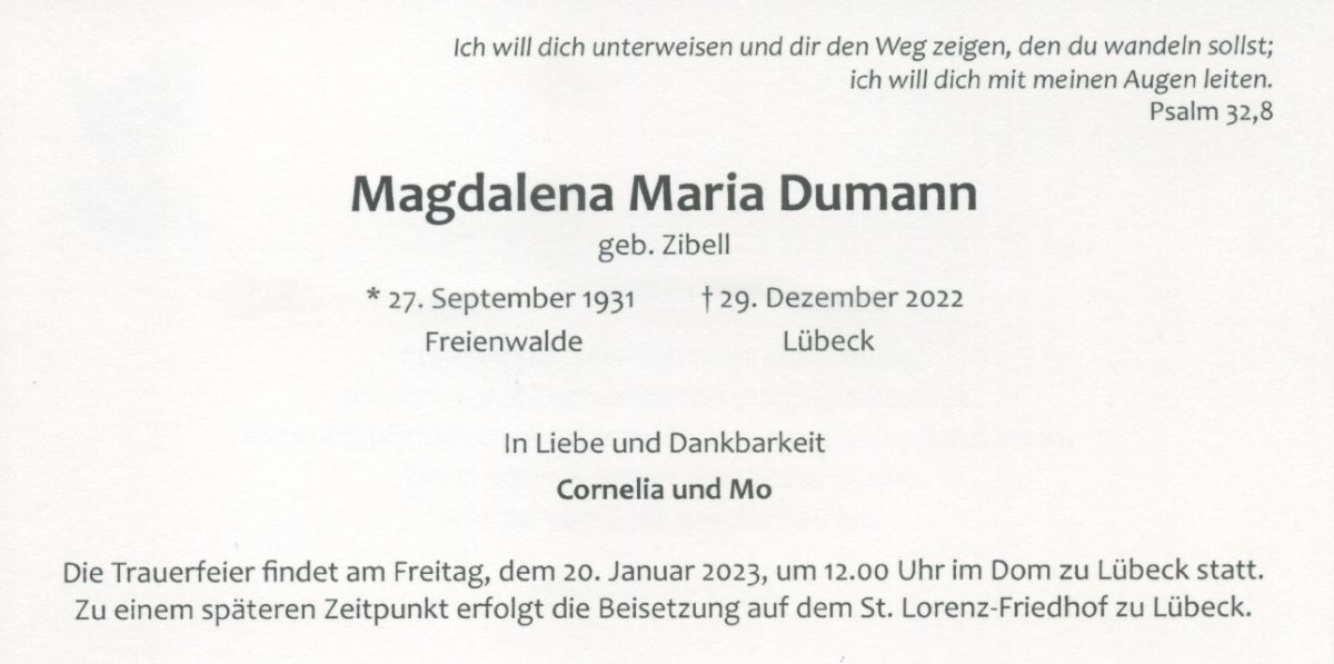 Magdalena Maria Dumanngestorben am 29. Dezember 2022