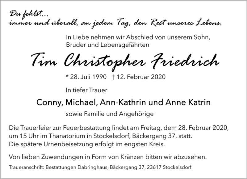 Tim Christopher Friedrichgestorben am 12. Februar 2020